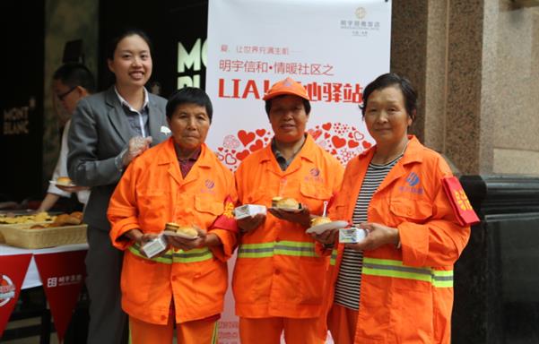 成都明宇麗雅飯店搭起“Lia!愛心驛站”,為區域內出租車司機、環衛工人、建筑工人等城市建設者派送愛心食品。
